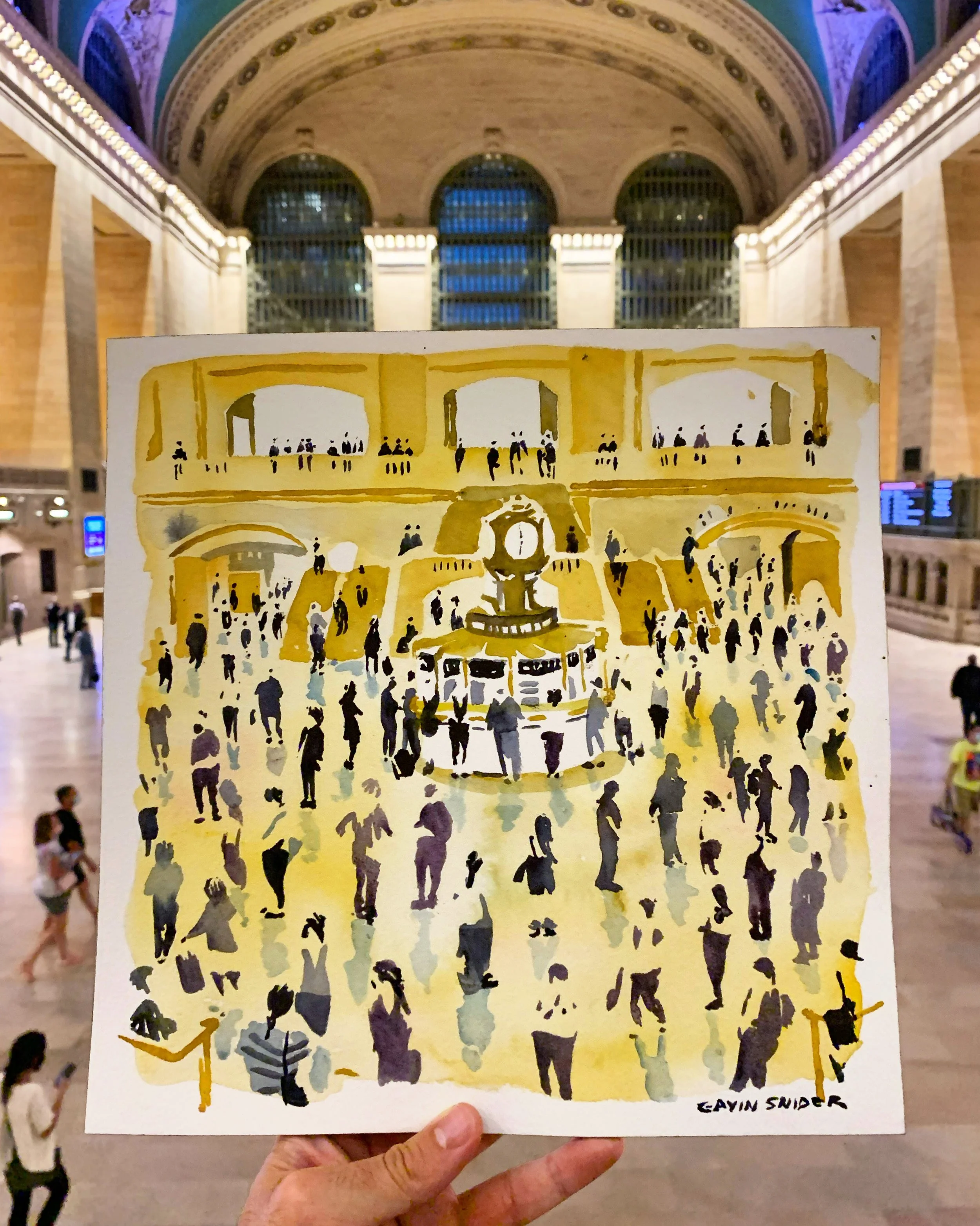 There’s a deep ledge on the west stair where you can rest your paints. Stop there. Look down at the ticketing booth. People are hurrying and strolling and waiting, casting slight shadows on the tan stone. Buy a ticket of your own. 6:45 on the Hudson Line. The leaves are changing along the river. What other reason do you need to get out of the city?